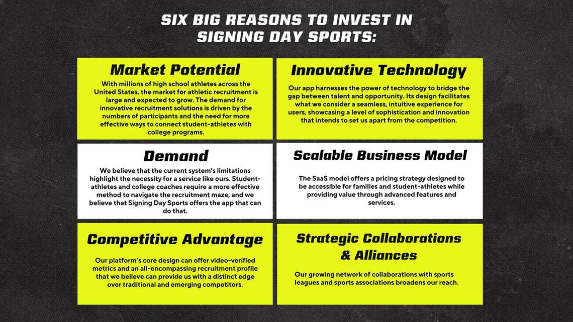 Investing in Signing Day Sports means becoming an investor in the modernization of student-athletic recruitment. Join our visionary team in this game-changing venture, where your investment can fuel the dreams of student-athletes nationwide.