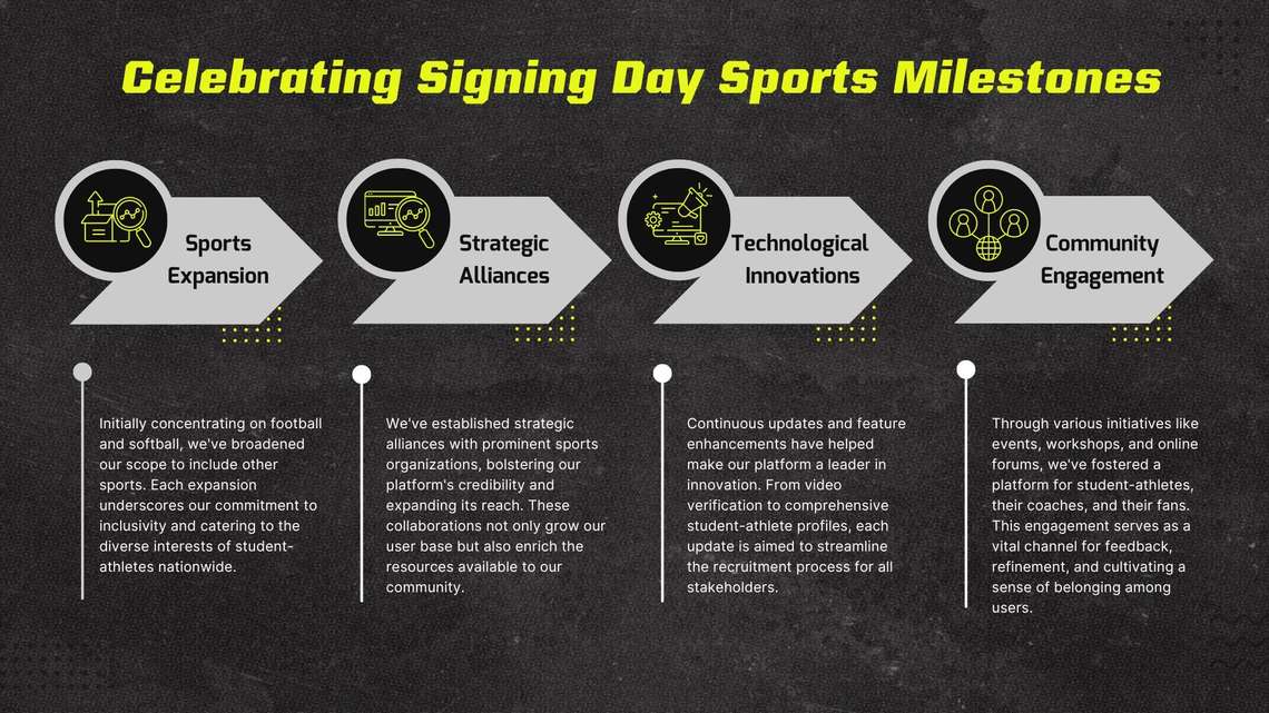 These milestones serve as the bedrock of Signing Day Sports' journey, shaping the future of our platform. As we progress, our unwavering focus remains on unlocking potential, bridging gaps, and creating an environment where every student-athlete can thrive.